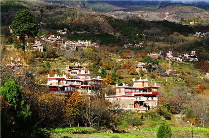 金秋,山寨呈現(xiàn)出一派多彩的畫面,樹葉漸次褪綠,漸染紅色,山頂是皚皚白雪,將田園牧歌式的畫卷展示在人們眼前。